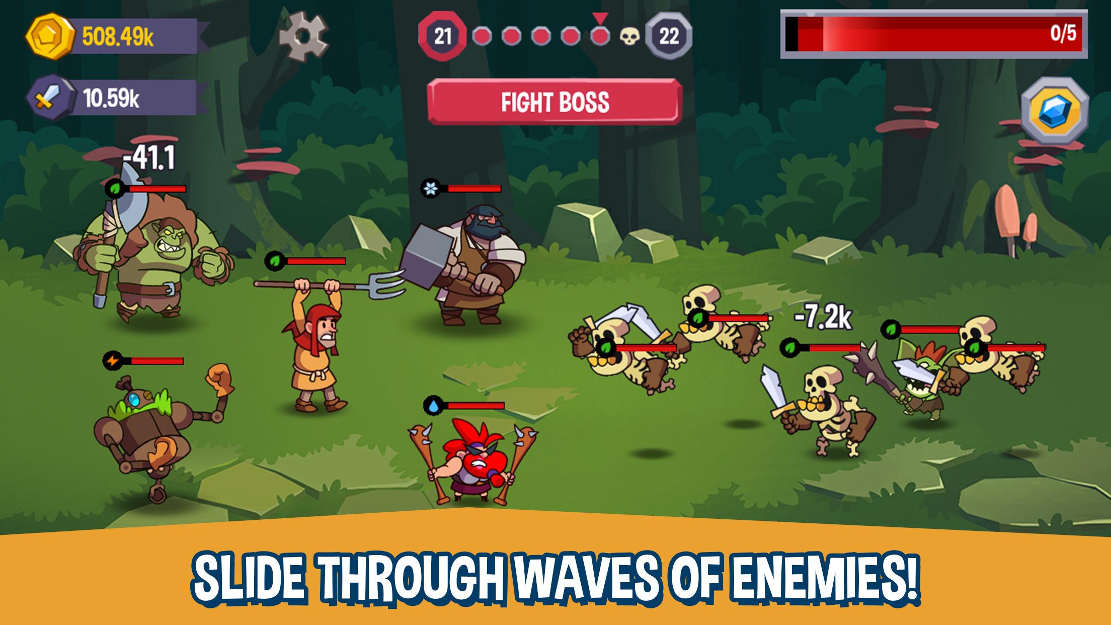 Deslize para lançar combos poderosos, deslize para aumentar seus heróis e deslize para coletar recursos extras. Luta bravamente através das ondas de monstros e chefes difíceis para avançar nos palcos e desbloquear novos heróis poderosos, itens poderosos e feitiços esmagadores.