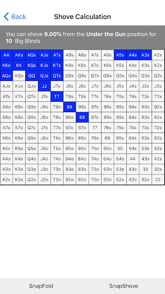 • SnapShove Pro oferece cálculos ainda mais precisos com uma gama mais ampla de opções para números de jogadores, antes e incrementos de big blind