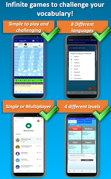 As palavras de scramble suportam jogos de quebra -cabeça em diferentes idiomas: