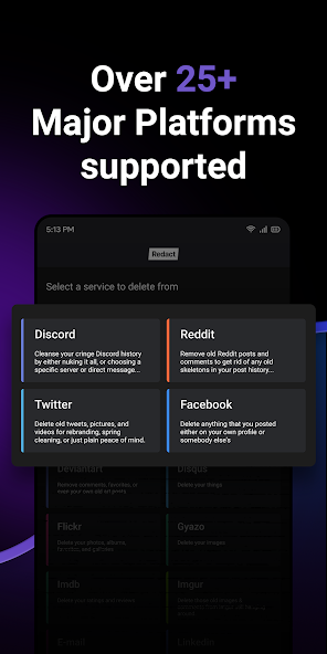 Масса Удалить свой цифровой след. Redact позволяет людям в частном порядке и надежно автоматизировать массовое удаление своего контента практически с каждой основной платформы.