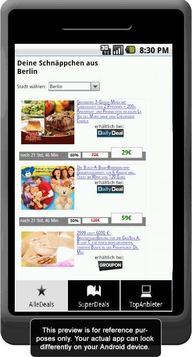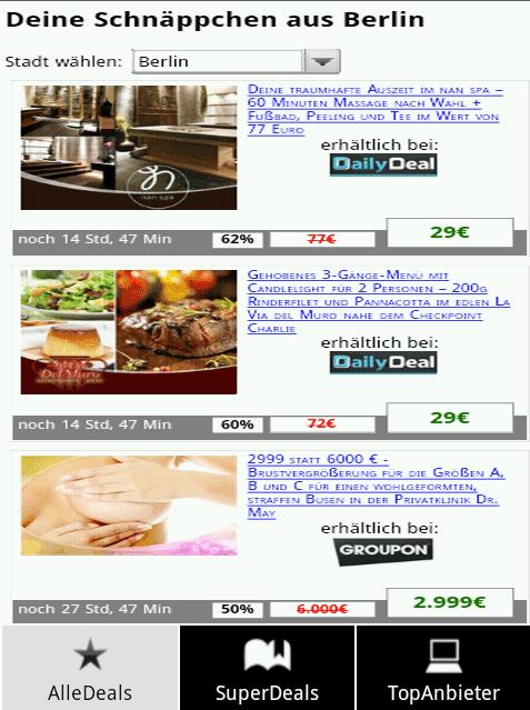 Кроме того, вы можете найти все сделки и ваучеры из своего собственного города и Groupon, Daily Deal и многих других поставщиков сделок по всей Германии. Город может быть выбран меню. Вы также найдете эксклюзивные предложения в нашем приложении и другие текущие онлайн -коды ваучеров и новые скидки каждый день.
