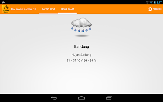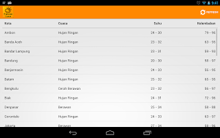 Заявление Prakiraan Cuaca будет отображать информацию о погоде в больших городах в Индонезии. Сначала в приложении Prakiraan Cuaca будет отображаться список крупных городов Индонезии. Выберите город, который вы хотите, после этого в приложении Prakiraan Cuaca будет отображаться подробная информация о погоде, сопровождаемой изображениями, информацией о температуре и влажностью.