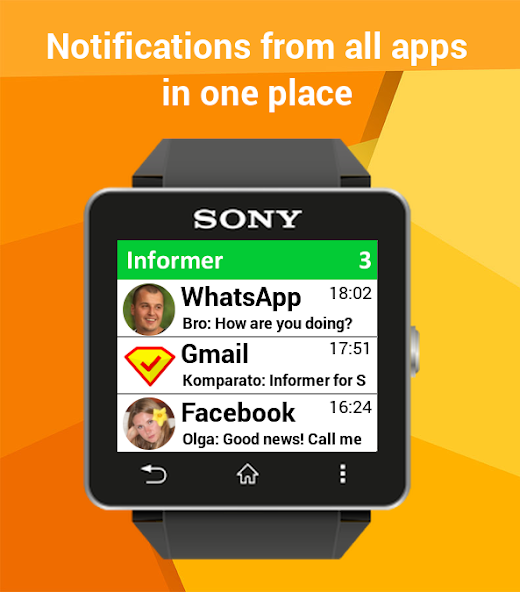 Informer приносит уведомления из разных приложений на ваше устройство Sony: SmartWatch MN2, SmartWatch SW2, гарнитуры SBH50 SBH52.
