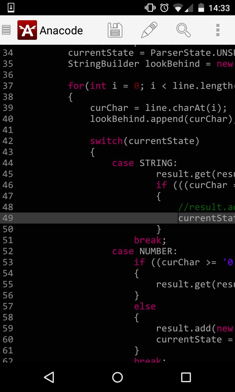 Anacode - это интегрированная среда разработки и редактор исходного кода для файлов Java, HTML, CSS, PHP, JavaScript и C/C ++, которые позволяют создавать и запускать приложения Android непосредственно на устройстве. Anacode может напрямую создать APK из исходного кода проекта Android, нажмите на элемент «Запустить» в меню. Просто откройте любой файл Java или XML, который является частью вашего проекта.