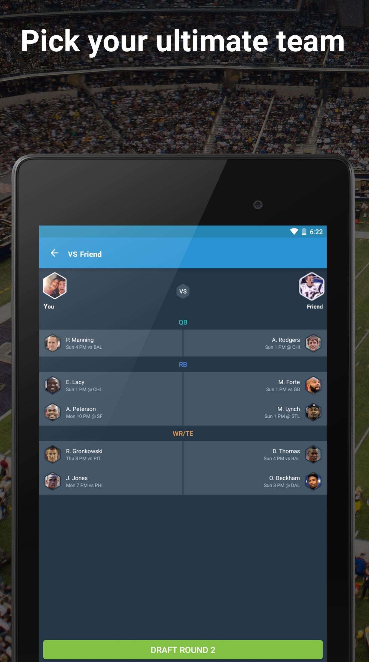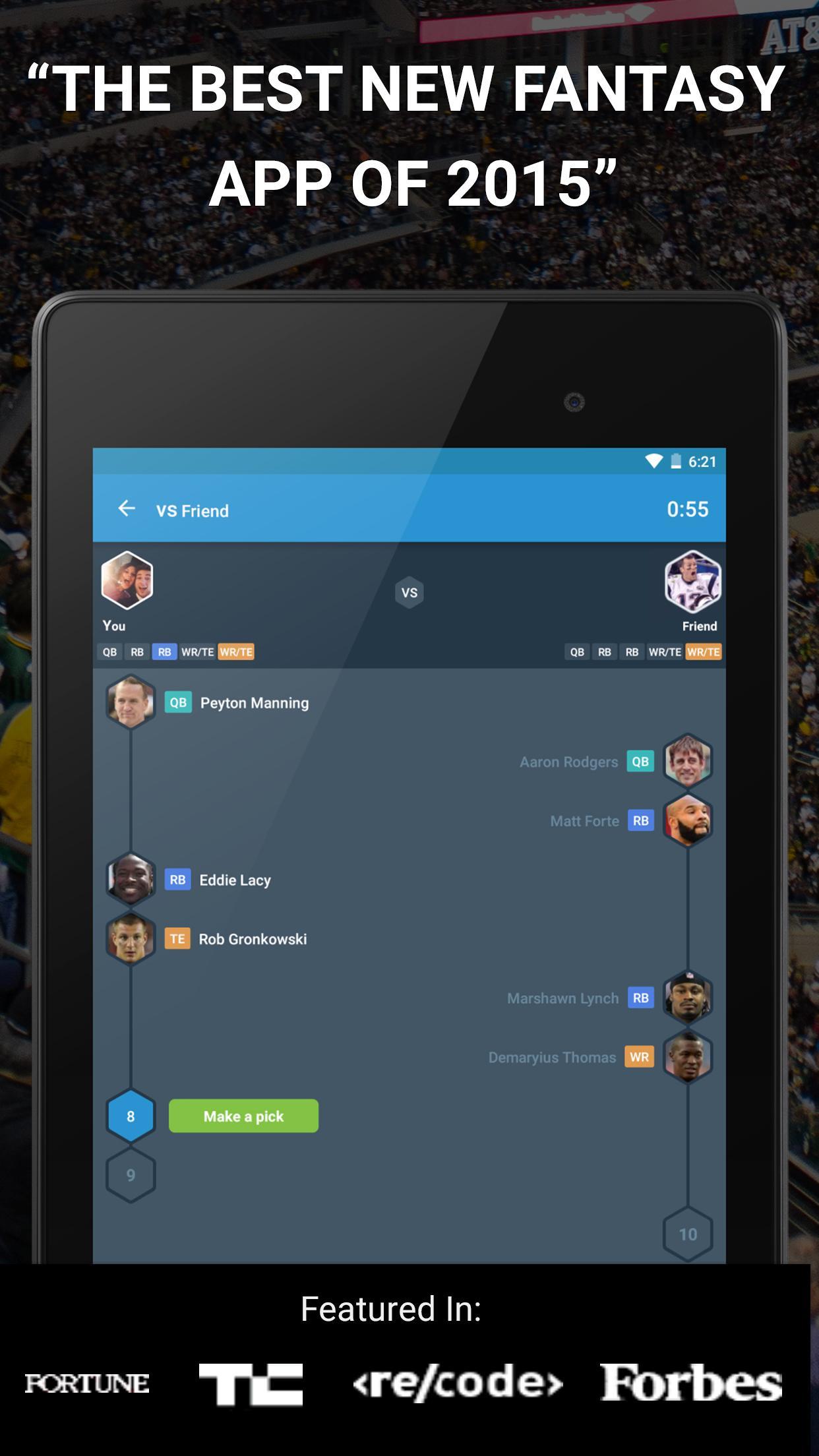 Лучшее новое приложение Fantasy 2015 года. Драфт - самый простой и интересный способ заниматься фэнтезийным спортом. Играйте лицом к лицу с друзьями или мгновенно подпадайте против противника. Вы можете играть за гордость или прибыль с настоящими деньгами!