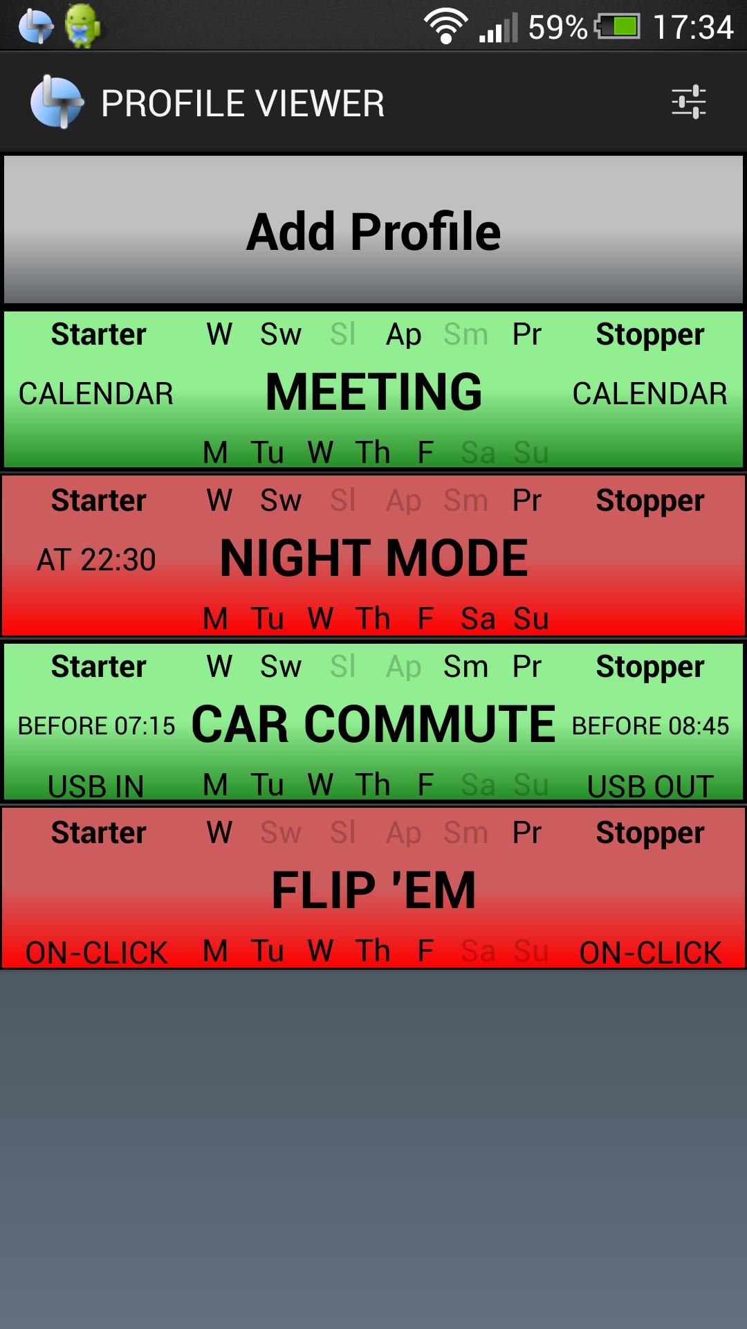 * Запустите свой профиль, используя действие Click, Day, время, события календаря, телефонные события, местоположения, а также комбинации (подробнее!)