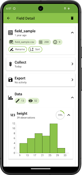 Field Book использует пользовательские макеты для различных типов данных, которые позволяют быстро вводить данные. Собранные черты определяются пользователем и могут быть экспортированы и передаются между устройствами. Примеры файлов предоставляются с установкой.