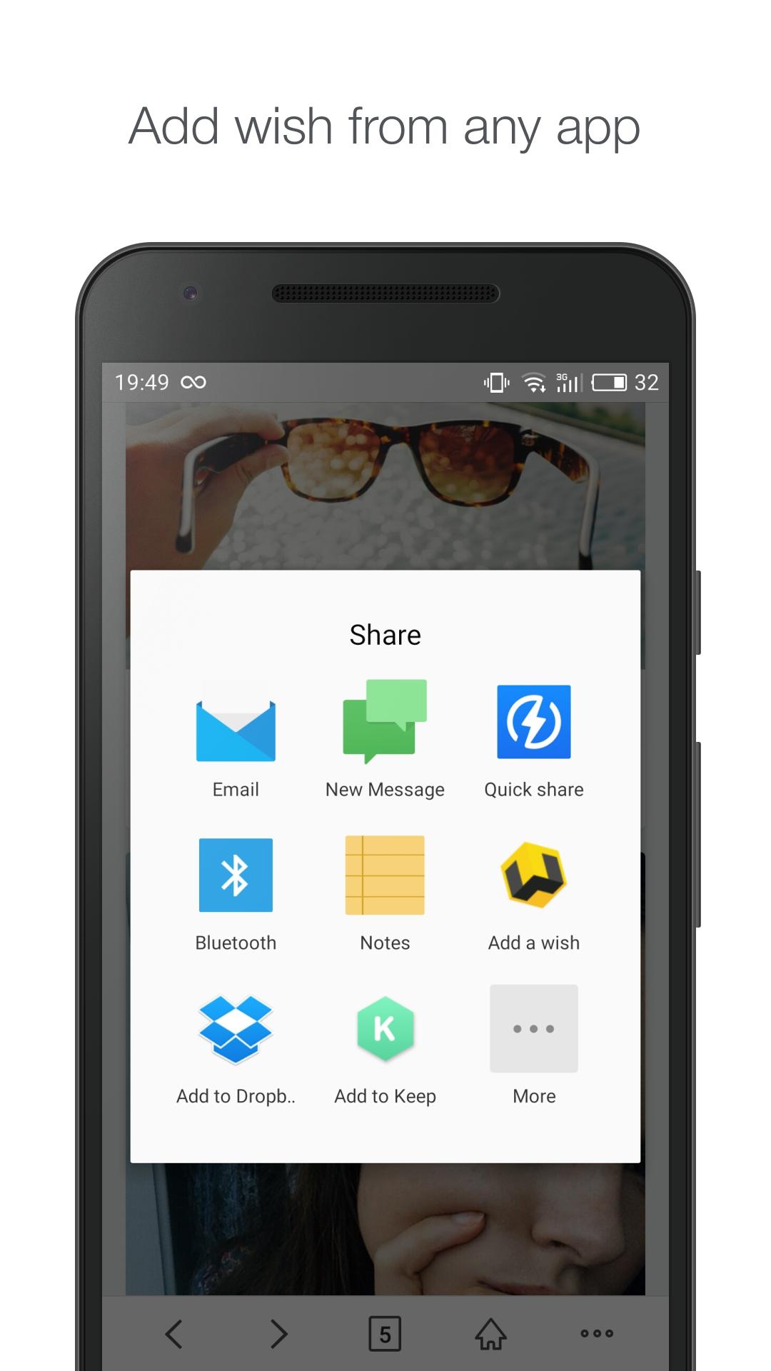 Это также лучший инструмент для покупок в Интернете. Наша уникальная функция "Share to WishList" делает очень удобным для сохранения того, что вы обнаружили в других приложениях или в Интернете. Просто перейдите на страницу продукта в приложении или в веб -браузере, нажмите кнопку «Поделиться» и выберите «Добавить желание» в список пожеланий бобов, мы автоматически извлекаем соответствующую информацию и сохраните продукт для вас. Это так просто!