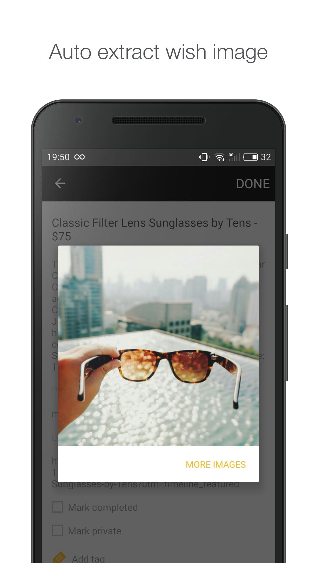 - Создать личный список пожеланий, список покупок или список подарков и получить информацию, такую как изображение, цена, название, описание, магазин и местоположение