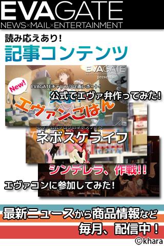 Evagate является официальным мобильным сайтом Evangelion. Как сайт информационного журнала, мы доставляем ежемесячный контент из оригинальных статей, которые можно прочитать только на этом сайте, на обоях и многое другое!