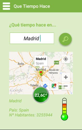 Введите название города или города, который вы хотите узнать о текущей температуре, и приложение будет выглядеть, поместив это место на глобальную карту и информируя как температуру, так и количество людей, живущих в этом месте.