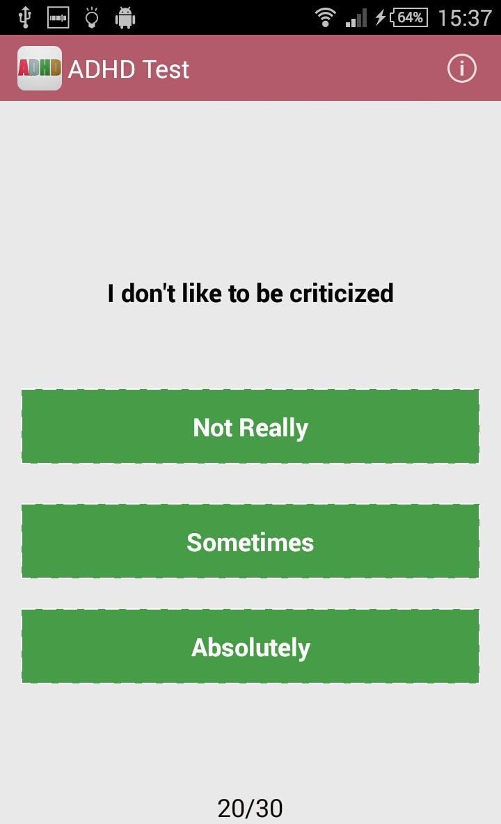 Отказ от ответственности: Сделано для образовательных целей, чтобы повысить осведомленность об общих симптомах. Добавить и СДВГ - серьезные состояния, и ни один мобильный или онлайн -тест не может дать реалистичный диагноз. Если вы подозреваете, что страдаете от этого состояния, пожалуйста, поговорите с профессионалом.