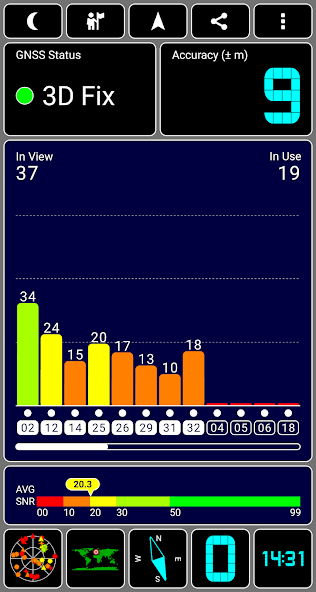 •GPS signal (SNR) bar chart, showing the signal strength for each satellite, as well as the accuracy and status of the GNSS network