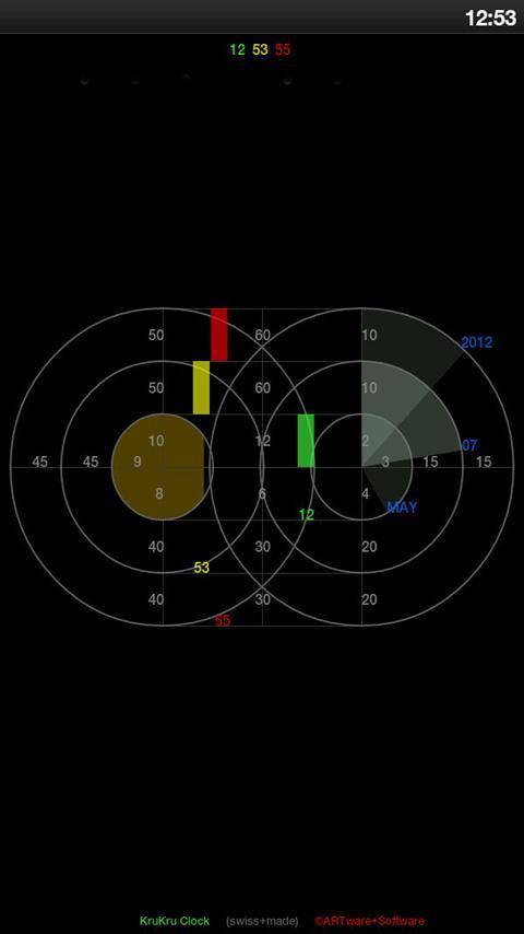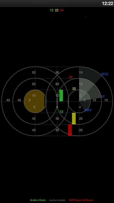 Бесплатные часы Krukru напоминают установку в ресторане Sushi Kru Kru, где блюда представлены на сборочной линии. Руки меняют скорость в зависимости от конфигурации, но все еще довольно легко определить время. Кроме того, отображаются фаза Луны и дата (в качестве варианта месяца/день/год). На устройствах размера планшета часы могут отображаться (виджет, как) на части экрана.