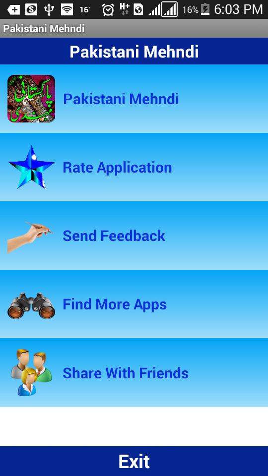 Это приложение содержит красивые и последние Pakistani Mehndi дизайны. который может использовать на каждом событии. Так же, как брак, функция Mehndi или везде, где вы должны использовать Mehandi. Вы можете найти дизайн рук, а также дизайн ног.