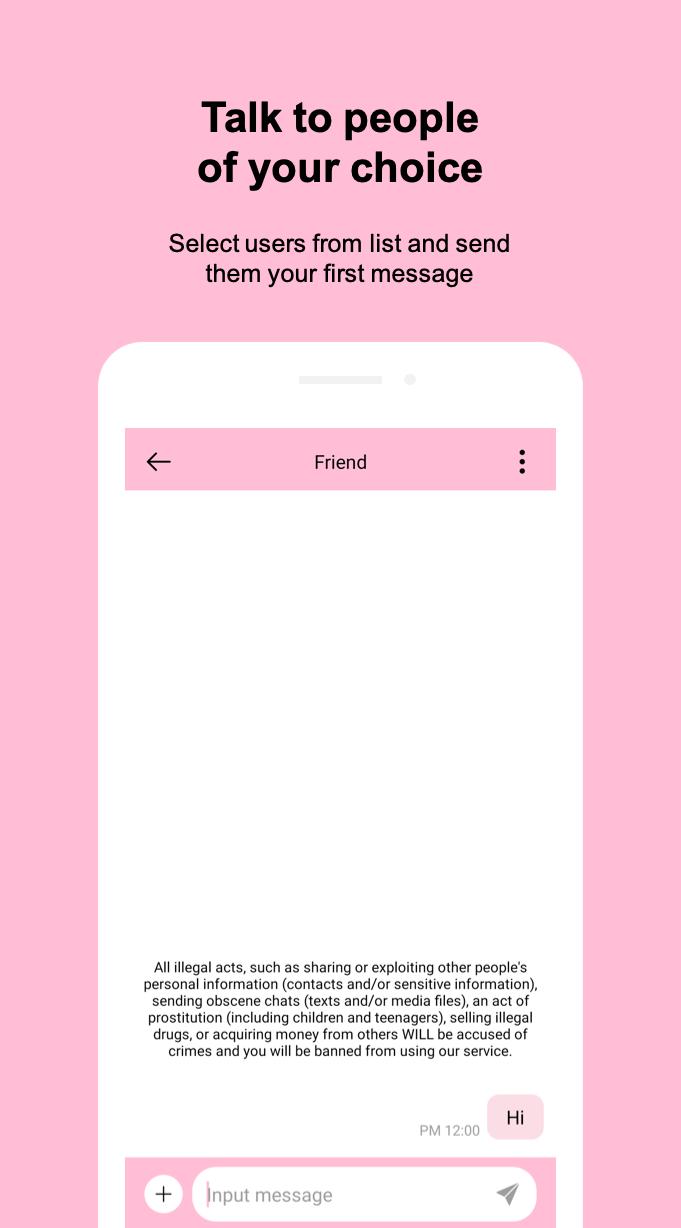 « P.Talk » позволяет пользователям по всему миру легко общаться. Для каждого пользователя несет ответственность за действия, которые они предпринимают при использовании нашего приложения. Мы не несем ответственность от незаконных действий, которые совершают люди, игнорируя предупреждения, изложенные на протяжении всего приложения.