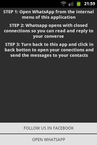 Просто откройте WhatsApp из меню Whatshide и прочитайте или ответьте на ваши разговоры, и как только вы выйдете из приложения, ваши сообщения будут отправлены, и никто не узнает об этом соединении с WhatsApp.