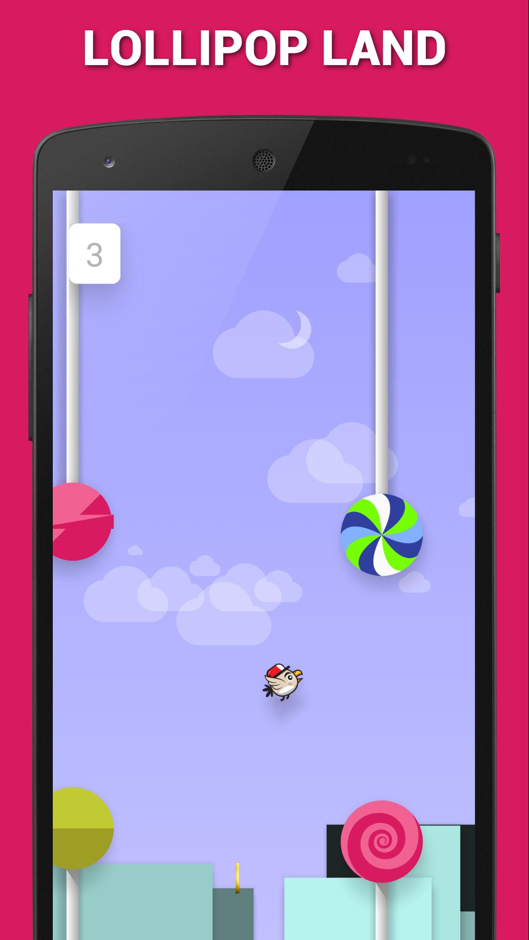 ? Вместо птицы ваш игрок является талисманом Android (Bugdroid). Вместо ретро-тематических труб, барьеры-леденцы на палочке. Когда вы нажимаете на экран, вы автоматически заходите в игру. Объект игры состоит в том, чтобы пройти через каждый барьер Lollipop, нажав на экран, чтобы Bugdroid не попал на землю.