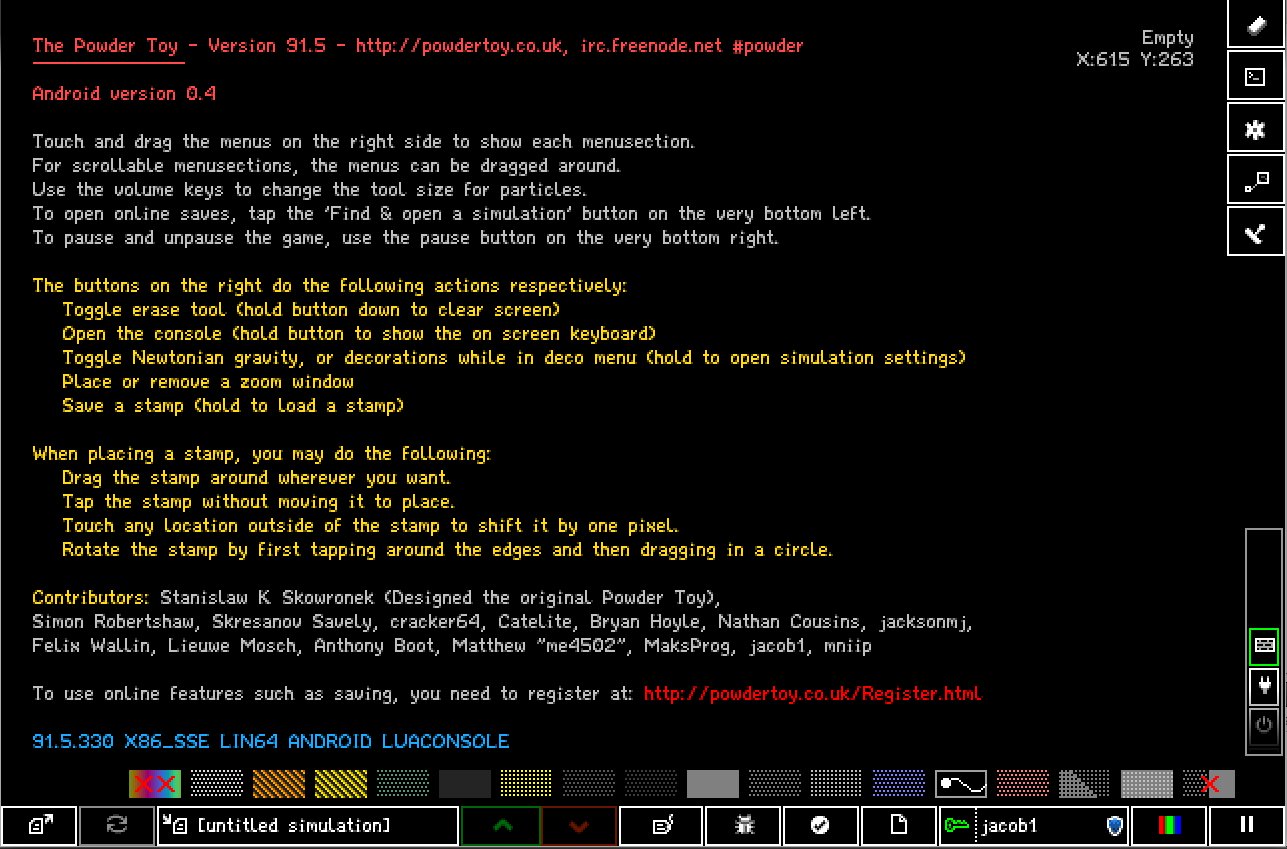 The Powder Toy теперь и на Android! На этот раз он официально поддерживается, совершенно бесплатен и слегка оптимизирован для устройств с сенсорным экраном вместо традиционной мыши и клавиатуры, с которыми обычно работает Powder Toy.