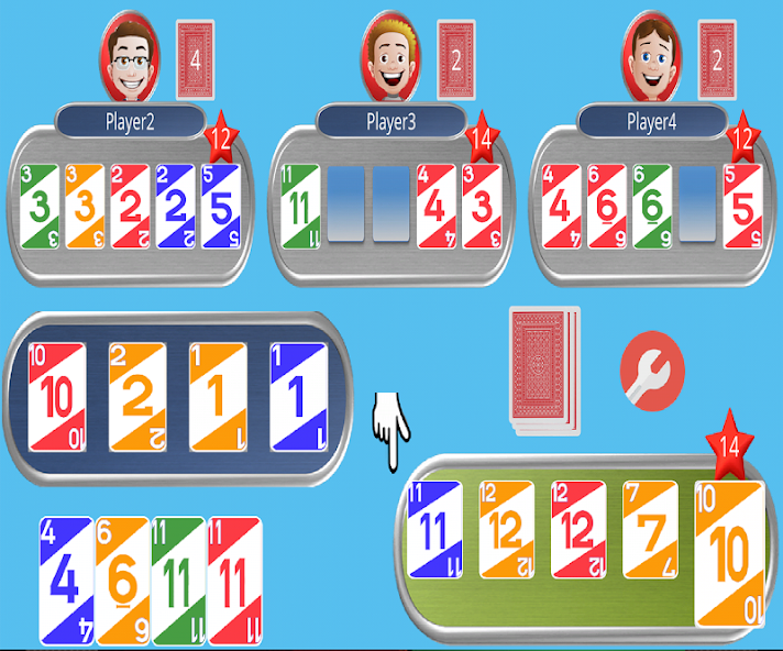 -> Они должны сыграть либо следующую карту в последовательном порядке, либо в дикую карту, используя любую карты в руке, верхнюю карту их стоковой кучи, либо верхнюю карту любой из четырех их сброчных свай.