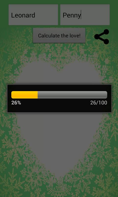 Это приложение является ключом к гармоничным отношениям. Введите свои имена, и новый развитый, сложный алгоритм рассчитает вашу возможную любовь в процентах друг с другом. <3