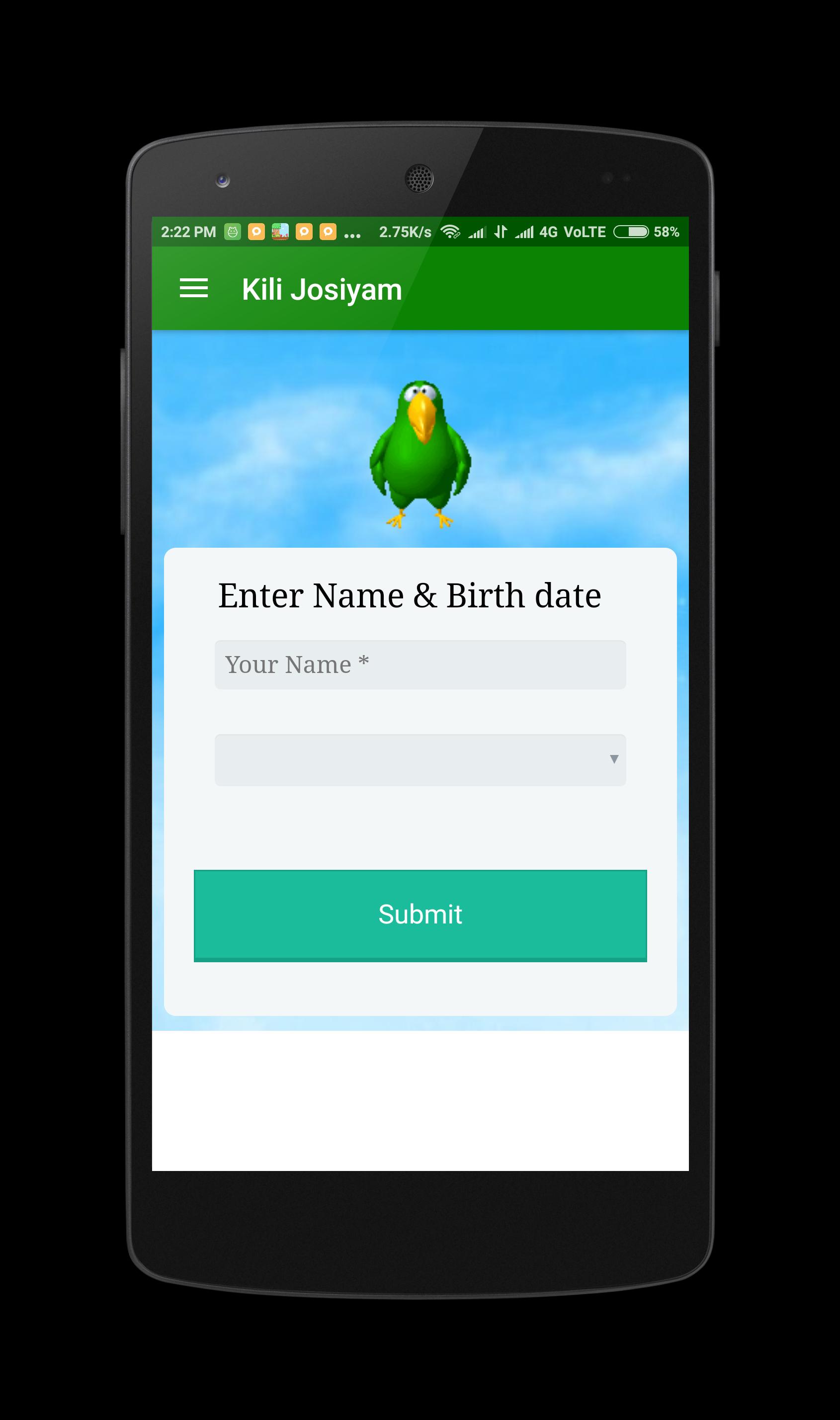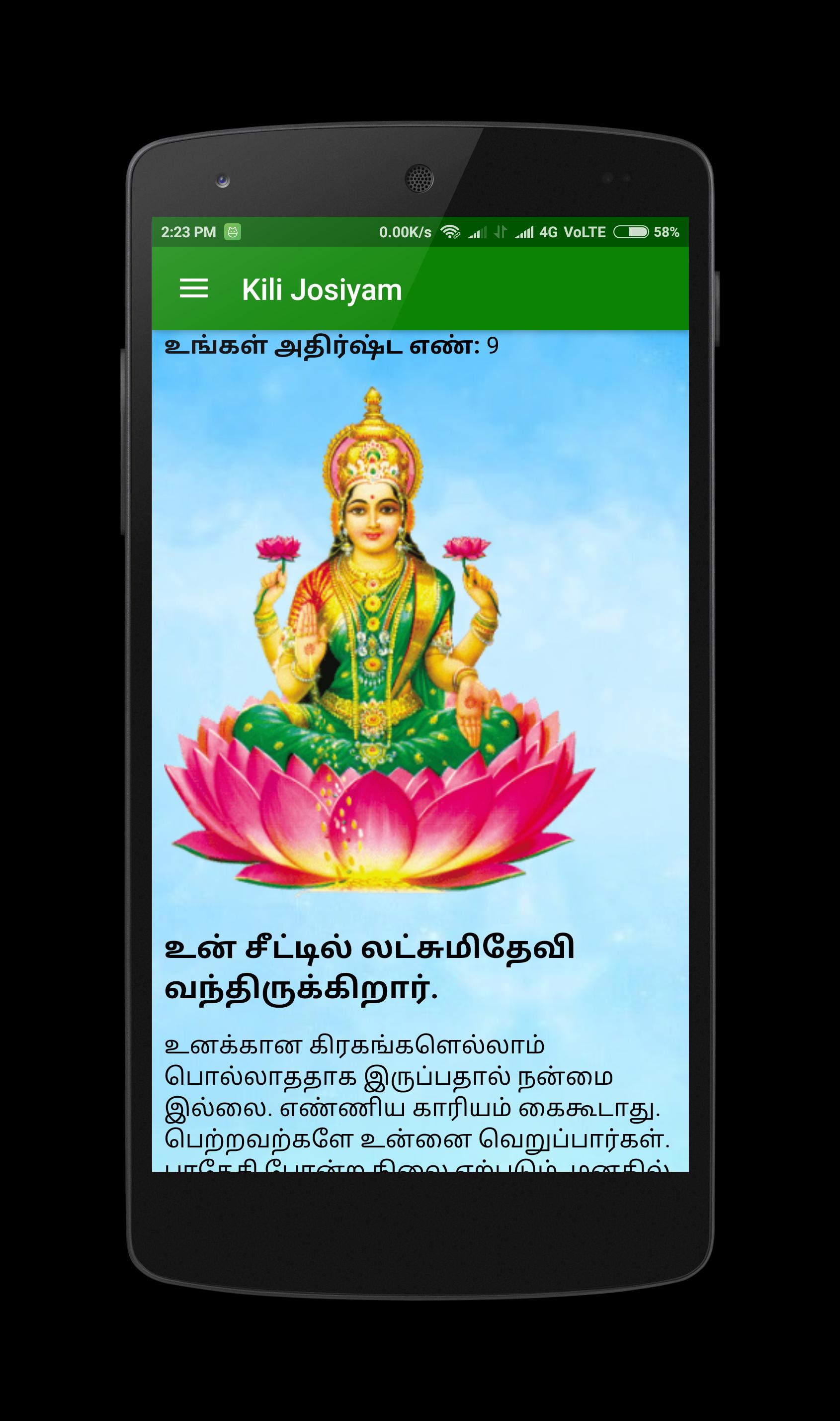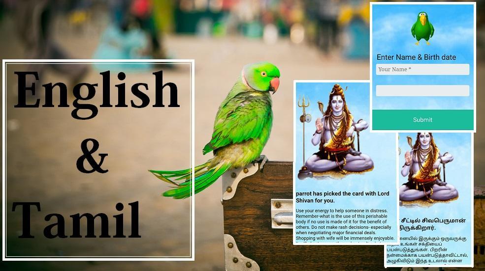 Астрология попугая ( Kili Josiyam ), которая наиболее известна в Тамилнаду, очень полезна для прогнозирования вашего будущего. Этот Kili Josiyam найдет ваш счастливый номер с вашим любимым Богом. Основываясь на тамильской астрологии, Панчангам, астрологии Агатиир и Агатияр Арудам, попугай может сказать вам самый точный прогноз для вашего будущего.