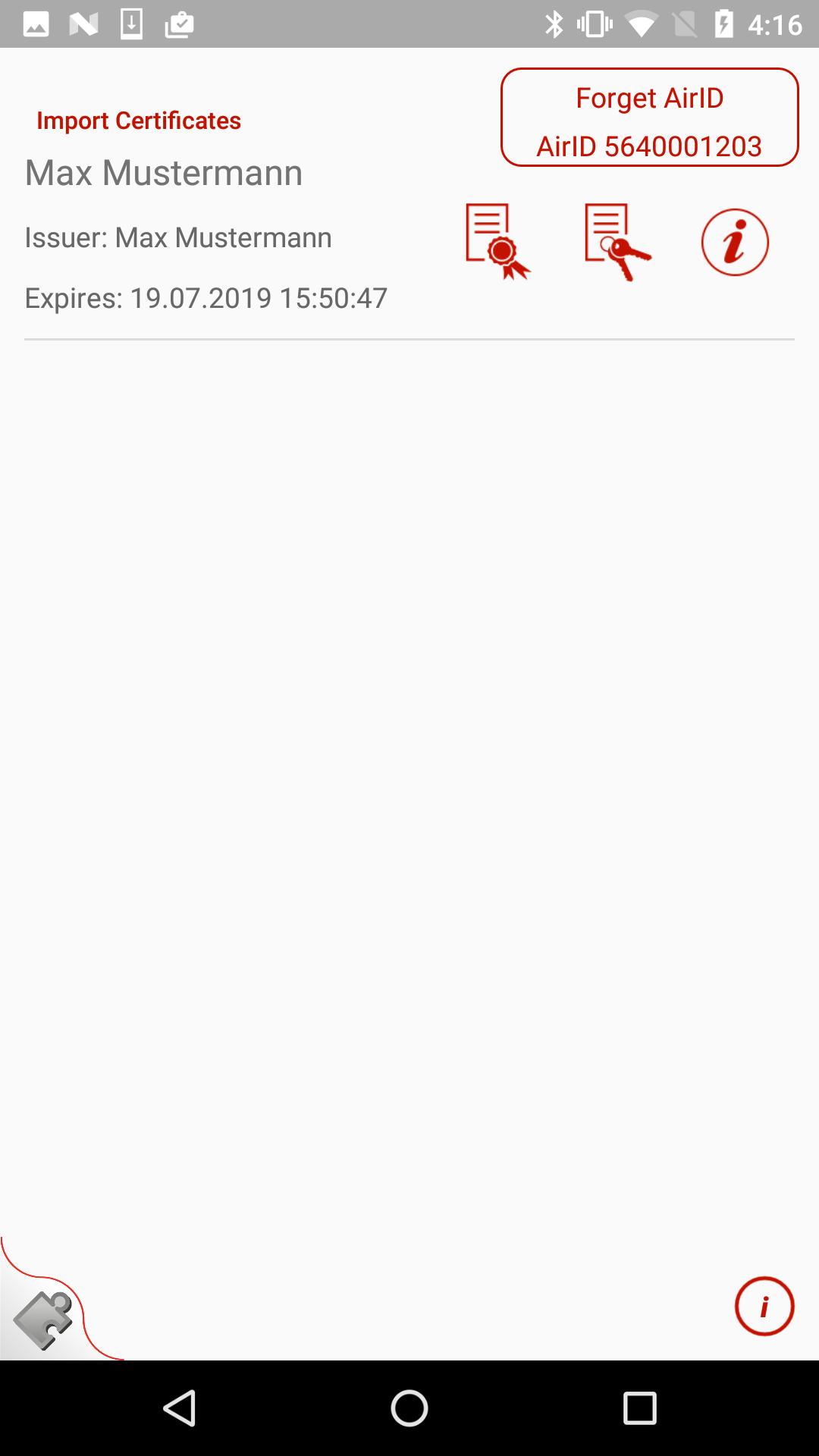แอพตัวอย่างนี้ใช้ความตั้งใจในการสื่อสารกับแอพ Central AID® หลังจากเลือกและเชื่อมต่ออุปกรณ์AID®กับแอพAID® Central App แล้วAIRID®จะถูกเก็บไว้ในแอพ Central AID®และส่งผ่านไปยังแอพตัวอย่างผ่านหน้าต่างป๊อปอัพ สำหรับการถ่ายโอนให้เลือกปุ่ม "เชื่อมต่อ AID" และเลือกตัวเลือก "เชื่อมต่อ" ในหน้าต่างป๊อปอัพ ก่อนที่จะใช้แอพตัวอย่างอุปกรณ์AID®จะต้องเลือกในแอพAID® Central Central