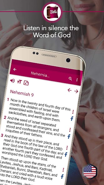 รวมฟังก์ชั่นการพูดออกมาดัง ๆ ที่จะอ่านให้คุณแต่ละบท King James Bible ด้วยเสียงที่ดี คุณสามารถควบคุมฟังก์ชั่น "อ่านออกเสียง" นี้ได้อย่างง่ายดายโดยใช้ปุ่มเสียงที่อยู่ทางด้านบนขวาของแอป คุณจะสามารถติดตามพระคัมภีร์ศักดิ์สิทธิ์ในขณะขับรถทำอาหารหรือเข้าร่วมงานทุกประเภทที่ไม่อนุญาตให้คุณอ่าน