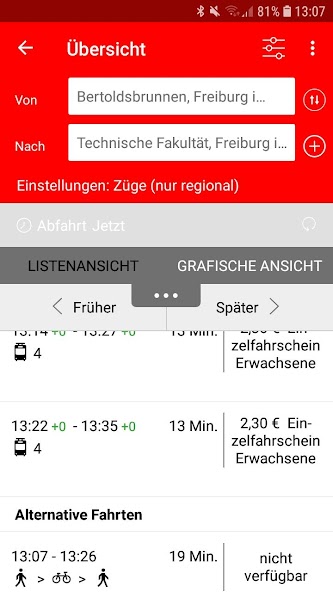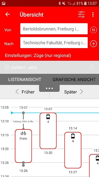 ข้อมูลเรียลไทม์มีให้สำหรับรถไฟรถโดยสารและรถรางเบา ๆ รวมถึงระบบเช่าจักรยานของเรา Frelo ดังนั้นคุณสามารถตรวจสอบได้ไม่ว่าการเดินทางของคุณจะเริ่มตรงเวลาปัจจุบันมีจักรยานเช่าของสถานีที่ต้องการหรือคุณสามารถเลือกการเชื่อมต่อทางเลือกได้ตามธรรมชาติ สำหรับการเชื่อมต่อกับ Freiburger Verkehrs AG มันจะถูกระบุหากยานพาหนะปราศจากสิ่งกีดขวาง