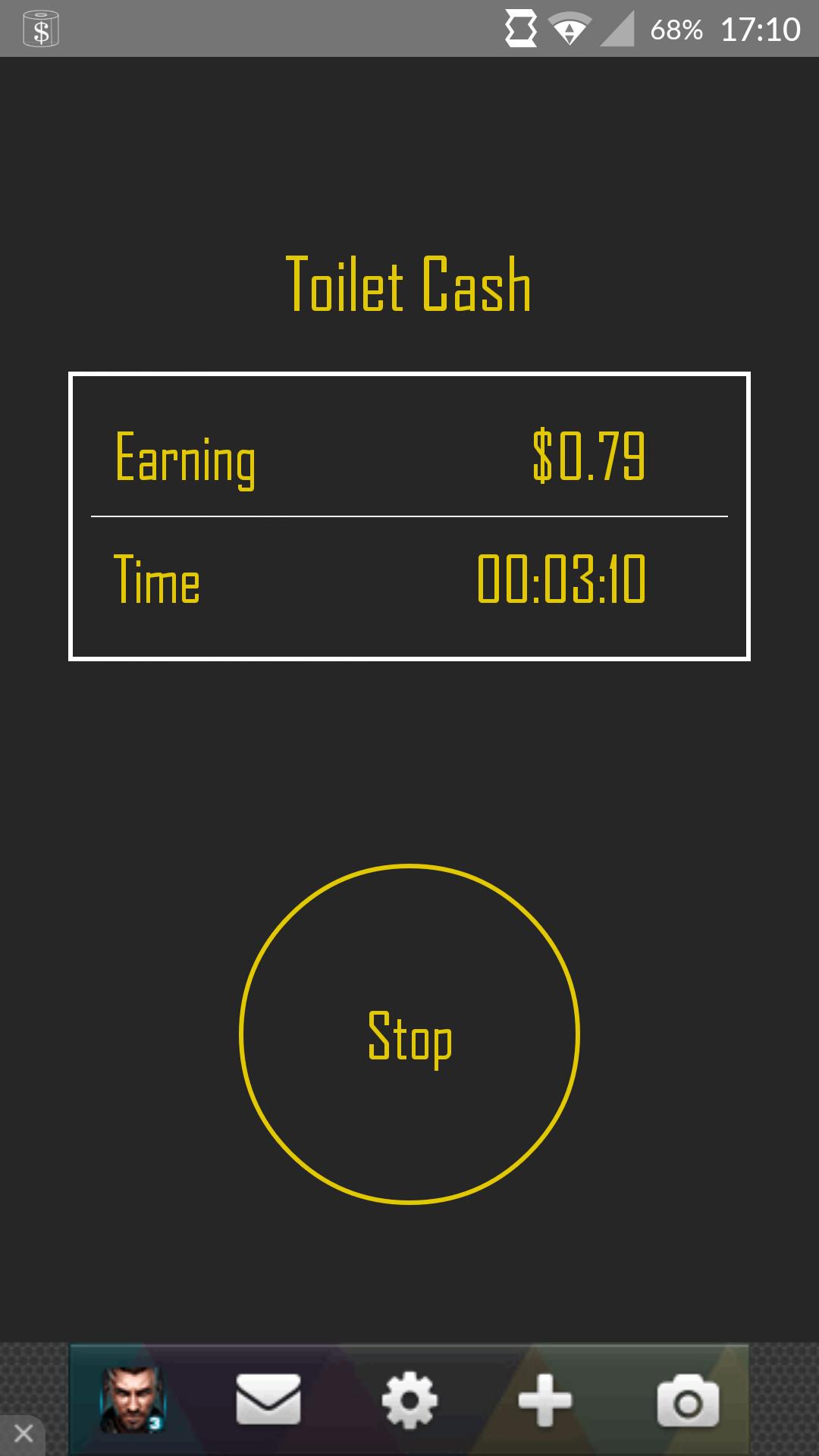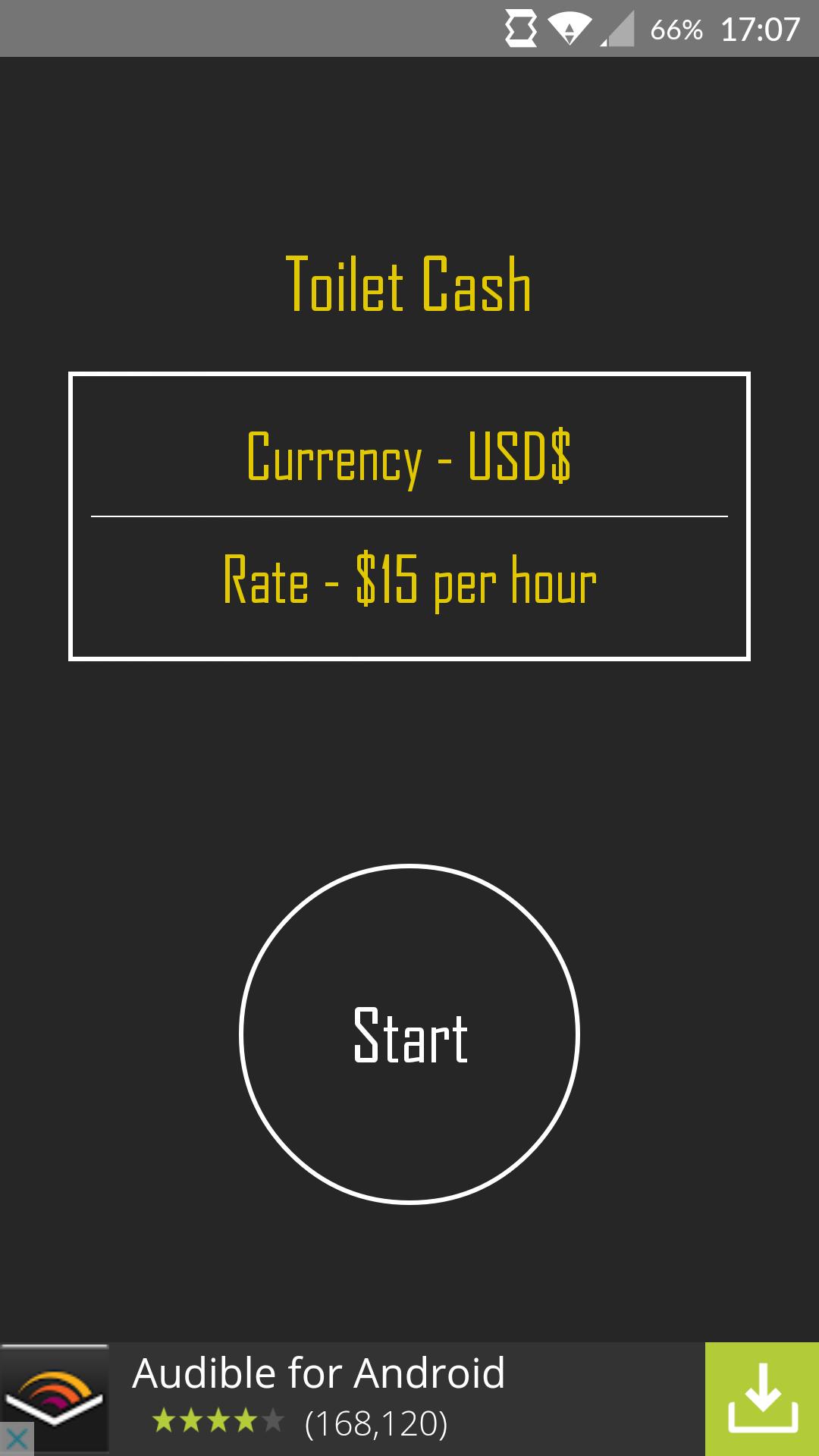 Toilet Cash เป็นตัวจับเวลาเงินเดือนสำหรับการคำนวณจำนวนเงินที่คุณได้รับจากการทำงานเมื่อคุณไม่ได้ทำงาน ซ่อนตัวอยู่ในห้องน้ำหนีจากเจ้านายของคุณทำให้ตัวเองมองไม่เห็น เปิดแอปป้อนสกุลเงินของคุณอัตรารายชั่วโมงและเริ่มจับเวลา ดูเงินสดม้วนเข้าหรือลดแอพและเปิดเกมหรือเรียกดูเว็บ เมื่อคุณตัดสินใจว่าคุณควรกลับไปทำงานจริงให้หยุดแอพและดูเงินที่คุณเพิ่งทำ ถ้าเช่นนั้นทำไมไม่แบ่งปันผลรวมกับเพื่อนของคุณ? หรือใช้จ่ายเงินใน Google Play Store? หรือสกรูระบบจริงๆและมอบให้กับการกุศล!