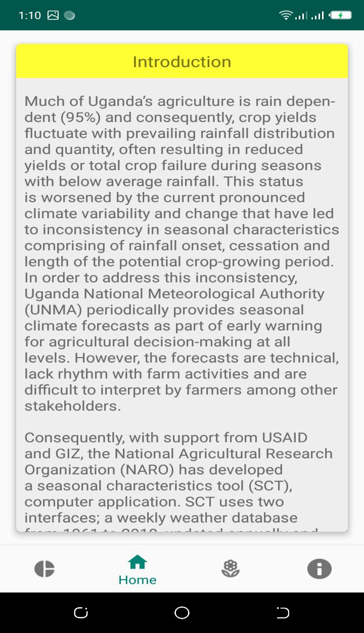 นี่คือแอพที่พัฒนาโดย NARL - Kawanda ภายใต้การกำกับดูแลของ Dr. Everline Komutunga ด้วยความตั้งใจที่จะนำลักษณะตามฤดูกาลของยูกันดาและการคาดการณ์ไปยังประชาชนทั่วไป