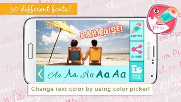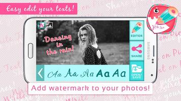 การแก้ไขภาพและการเขียนบนรูปภาพไม่เคยง่ายกว่านี้มาก่อน! ด้วย Write Text on Pictures คุณสามารถทดลองกับแบบอักษรน่ารักที่หลากหลายหรือเพิ่มเส้นขอบ, การแรเงา, เติม, ปรับความทึบและเพิ่มวันที่และการประทับเวลาฟรี! หากคุณได้สร้างภาพคอลลาจที่คุณชื่นชอบเอฟเฟกต์ภาพถ่ายและตัวกรองที่ใช้และเพิ่มเฟรมรูปภาพสิ่งต่อไปที่ต้องทำคือดาวน์โหลดแอพ Picsay นี้และเพิ่มประกายของสัมผัสส่วนตัวของคุณลงในภาพ Cymera ของคุณ! เพิ่มรูปถ่ายหรูหราของคุณด้วยคำพูดและข้อความที่ยอดเยี่ยมและสนุกกับการใช้แอพบูธภาพถ่ายน่ารักนี้ ปรับปรุงภาพคู่รักรักและภาพตลกโดยใช้ Pro Pro Pro Pro 2014 นี้! แอพภาพถ่ายลายน้ำและโปรแกรมแก้ไขข้อความเป็นโฟโตลับใหม่ - รับของคุณวันนี้!