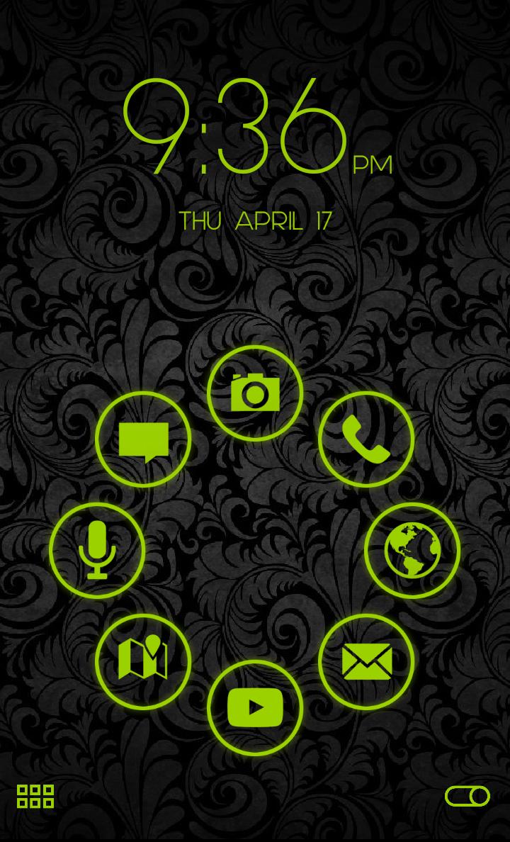 ฉันขอแนะนำให้ผู้ใช้ติดตั้งแพ็คไอคอน Stamped Holo Green ถ้าไม่ติดตั้งโดยอัตโนมัติและเปิดใช้งานโดยทำสิ่งต่อไปนี้: แอพลิ้นชัก> ปุ่มเมนู> การตั้งค่าธีม> Bubbles: The Icons Theme