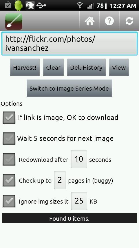 Harvest, Fusker, Pluck, RIP Images, Web Harvest, Image RIP ฯลฯ จากหน้าเว็บโดยใช้เครื่องมือนี้ เพียงพิมพ์ URL เว็บในกล่องแล้วกด Harvest เพื่อฉีกผ่านหน้าและบันทึกภาพลงใน SDCARD