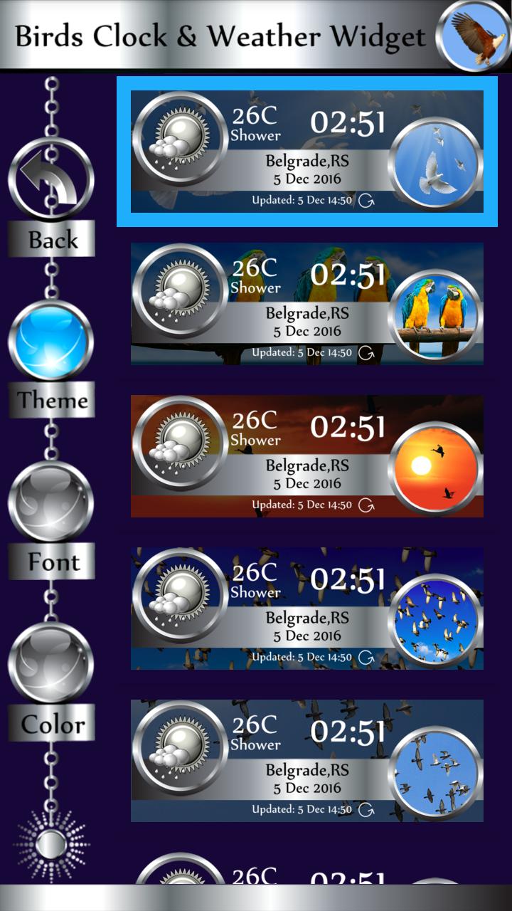 มีตัวเลือกให้คุณเลือกระหว่างวิดเจ็ตขนาดเล็กและขนาดใหญ่ แต่คุณสามารถใช้ทั้งสองอย่างหากคุณต้องการบนหน้าจอที่แตกต่างกัน ตั้งค่าพื้นหลังสำหรับแต่ละรายการแล้วตรวจสอบการตั้งค่าสำหรับตัวอักษร คุณสามารถเปลี่ยนสีและแบบอักษรของพวกเขาและด้วยวิธีนี้คุณจะปรับแต่งอุปกรณ์ของคุณในแบบที่ดีที่สุด Birds Clock & Weather Widget ล่าสุดล่าสุดให้ข้อมูลที่ยอดเยี่ยมมากมายและจะกลายเป็นแอปพลิเคชันที่คุณชื่นชอบอย่างรวดเร็ว คุณสามารถดูรายละเอียดเกี่ยวกับความดันบรรยากาศความเร็วของลมและระดับความชื้นและเวลาที่พระอาทิตย์ตกและพระอาทิตย์ขึ้นเกิดขึ้นเช่นกัน! หากคุณวางแผนที่จะจัดปิคนิคในสวนกับเพื่อนของคุณคุณจะพบว่าข้อมูลนี้มีประโยชน์อย่างแน่นอน