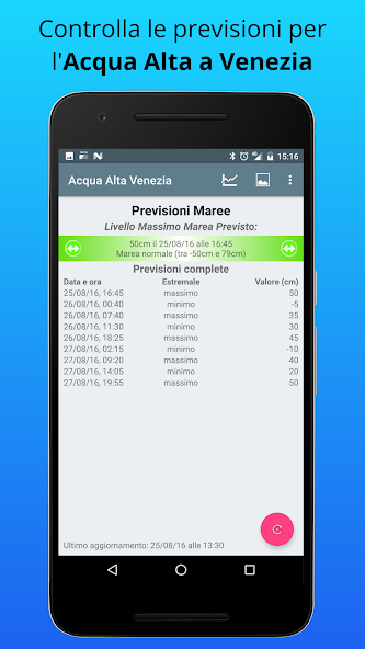 ดังนั้นนี่คือแอพที่เหมาะสมสำหรับคุณการรวบรวมข้อมูลจาก "Comune di Venezia" คุณสามารถตรวจสอบตารางพยากรณ์ Hight Tide สำหรับเมืองที่สวยที่สุดในโลก!