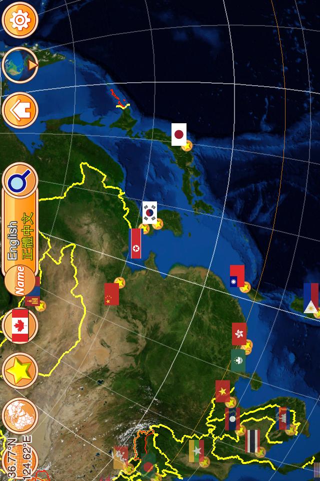 249 ประเทศ (โดย ISO 3166-1) และ 50 รัฐของสหรัฐอเมริกาในแอพนี้ เล่นได้ง่ายโดยการควบคุมท่าทาง แตะสองครั้งเพื่อเชื่อมโยงไปยัง Wikipedia และเลือกธงที่สมจริง เล่นเพลงชาติ