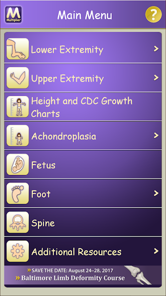 -เราได้สอนวิธี Multiplier มานานกว่า 19 ปีในหลักสูตรความผิดปกติของ Baltimore Limb Formity ประจำปี (www.deformitycourse.com) การคำนวณเหล่านี้มักจะดำเนินการด้วยมือโดยใช้สูตรต่าง ๆ การคำนวณบางอย่างเป็นเรื่องง่าย แต่อื่น ๆ เกี่ยวข้องกับสูตรที่ซับซ้อนมากขึ้น การใช้แอพนี้จะช่วยลดเวลาที่จำเป็นสำหรับการคำนวณตามปกติและลดข้อผิดพลาด คุณต้องป้อนข้อมูลบางอย่าง (เพศอายุความยาว) และแอพจะคำนวณคำตอบโดยใช้สูตร Multiplier ที่เหมาะสม