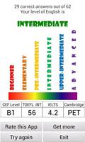 มันจะกำหนดระดับภาษาอังกฤษของคุณในฐานะผู้เริ่มต้น, ประถมศึกษา, ก่อนวัยรุ่น, กลาง, ระดับกลาง, ระดับบนหรือขั้นสูง ผลลัพธ์อีกวิธีหนึ่งจะแสดงในรูปแบบต่าง ๆ ที่ใช้โดยผู้ให้บริการสอบภาษาอังกฤษที่ได้รับความนิยมมากที่สุด: CEF, IELTS, TOEFL IBT และการสอบ Cambridge