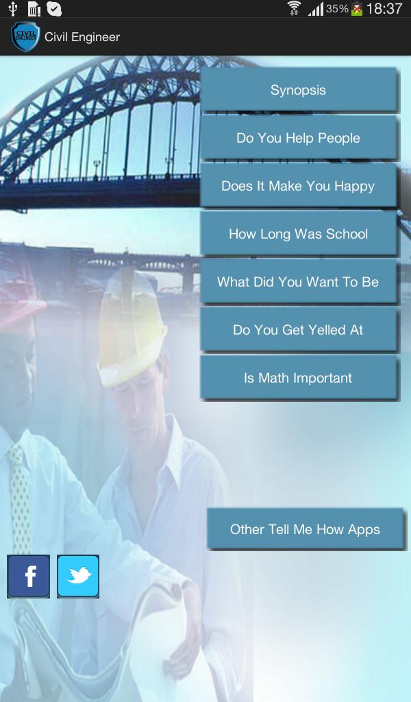 ในแอพนี้ Civil Engineer Epi Salazar ช่วยโฮสต์เจฟฟ์การ์ดเนอร์เข้าใจด้านเทคนิคของถนนสะพานและอาคาร วิชาที่ครอบคลุมรวมถึง: เราจะกลายเป็น Civil Engineer ได้อย่างไร? Civil Engineer ทำอะไร? Civil Engineer สร้างถนนจริงหรือไม่? เหตุใดคณิตศาสตร์จึงสำคัญที่จะเป็น Civil Engineer ? การสำรวจคืออะไร? คุณต้องไปเรียนที่วิทยาลัยเพื่อเป็น Civil Engineer หรือไม่? ใครจะเป็น Civil Engineer ที่ดี? สาว ๆ สามารถเป็น Civil Engineer ได้หรือไม่? Civil Engineer ทำงานเพื่อใคร? เป็นสิ่งสำคัญที่ Civil Engineer จะต้องรู้เกี่ยวกับคอมพิวเตอร์หรือไม่? ต้องมีใบอนุญาตประเภทใดในการเป็น Civil Engineer ?