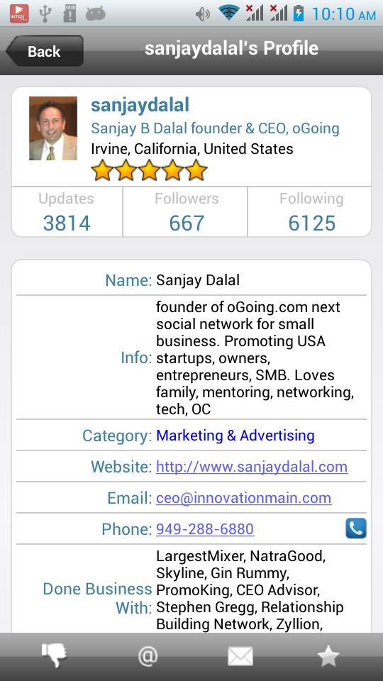 แอพ oGoing.com เป็นเครือข่ายโซเชียลทางธุรกิจที่มีส่วนร่วมกับลูกค้าใหม่และลูกค้าปัจจุบันสร้างความสัมพันธ์ที่ภักดีและยอดขายเริ่มต้นโดยใช้โซเชียลมีเดียล่าสุด คิดว่า oGoing.com เป็นผู้จับคู่ธุรกิจ!