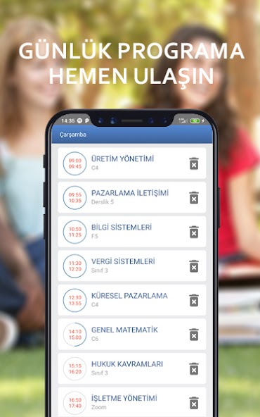 มันเป็นแอปพลิเคชั่นที่รวดเร็วและใช้งานได้จริงที่คุณสามารถเพิ่มกำหนดการหลักสูตรและการเข้าถึงได้ตลอดเวลา คุณสามารถดูจำนวนนาทีที่เหลือจนกว่าจะสิ้นสุดบทเรียนสองโดยสอง คุณสามารถแบ่งปันหลักสูตรของคุณกับผู้ใช้รายอื่นและเพิ่มหลักสูตรที่แชร์โดยผู้ใช้รายอื่นในแอปพลิเคชันของคุณเอง ด้วยวิดเจ็ตของมันตารางบทเรียนของคุณสำหรับวันนั้นอยู่บนหน้าจอของคุณ