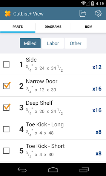 เรียกดูไดอะแกรมการตัดรายการชิ้นส่วนและการเรียกเก็บเงินของวัสดุหนึ่งไป กล่องกาเครื่องหมายช่วยให้คุณติดตามไดอะแกรมที่ถูกตัดซึ่งวัสดุที่ซื้อมาแล้วและชิ้นส่วนใดที่เสร็จสิ้น