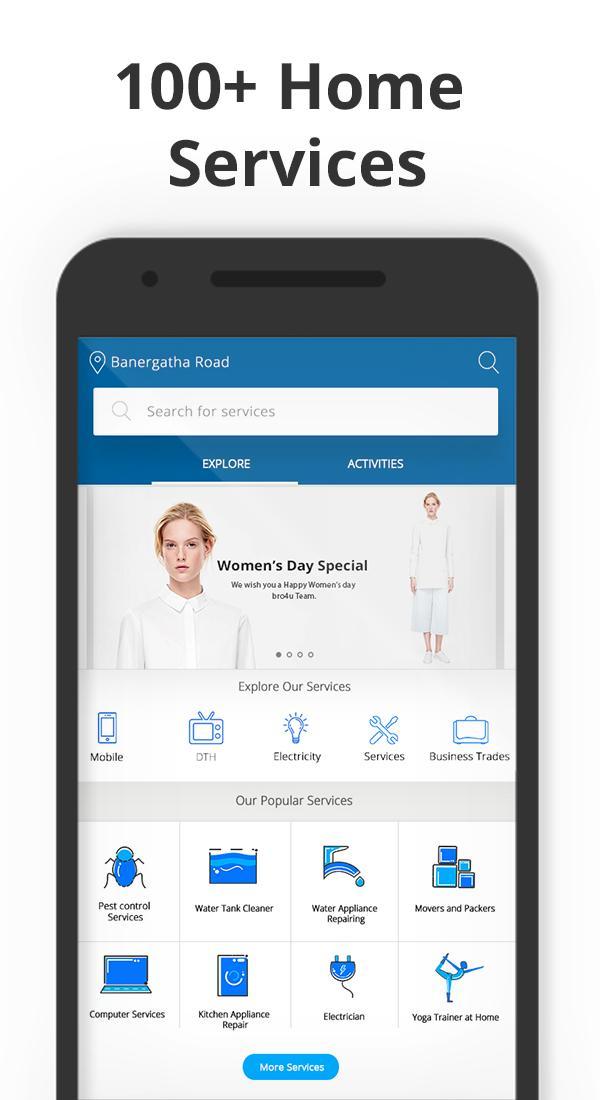 แอพ Bro4u มีบริการมากกว่า 50 รายการ ป้อนตำแหน่งวันที่และเวลาของคุณเพื่อค้นหาผู้เชี่ยวชาญด้านบริการที่มีอยู่ใกล้เคียงทุกที่ในบังกาลอร์และไฮเดอราบัด