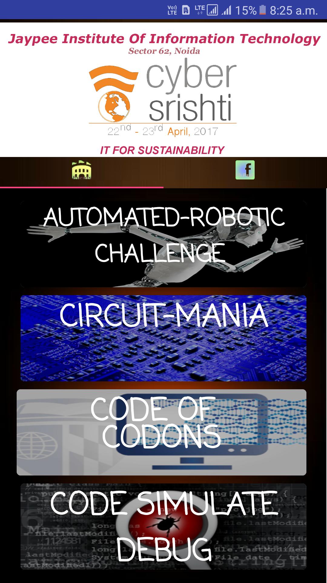 ด้วยคำขวัญของเทคโนโลยีกระตุ้นการเชื่อมโยงทางวิทยาศาสตร์และนวัตกรรมสถาบันเทคโนโลยีสารสนเทศของ Jaypee นำเสนอรุ่นที่ 3 ของเทศกาลเทคนิคประจำปี- Cyber Srishti นับตั้งแต่เริ่มก่อตั้ง Cyber Srishti ได้พยายามสร้างออร่าวิทยาศาสตร์และเทคโนโลยีที่ไม่มีใครเทียบ ดังนั้นด้วยการมีส่วนร่วมของนักเรียนอย่างล้นหลามและการเข้าถึงวิทยาลัยกว่า 250 แห่งไซเบอร์ Srishti จึงกลายเป็นหนึ่งในเทศกาลทางเทคนิคที่จัดตั้งขึ้นมากที่สุดซึ่งจัดขึ้นในหมู่วิทยาลัย Delhi-NCR Cyber Srishti จึงพยายามให้เยาวชนมีแพลตฟอร์มเพื่อแสดงความสามารถและทักษะของพวกเขาในการแข่งขันที่ถูกตัดทอนแสดงเทคโนโลยีผู้บุกเบิกและการวิจัยจากทั่วประเทศและโต้ตอบกับบุคลิกที่มีชื่อเสียง มันมีจุดมุ่งหมายที่จะไม่เปิดเผยขอบเขตของวิทยาศาสตร์ที่แตกต่างกันและใช้ประโยชน์จากจินตนาการของมนุษย์ได้ดีที่สุดเพื่อบรรเทาคนทั่วไปของปัญหาทั่วไป แต่มีความสำคัญกับการซ้อมรบของเทคโนโลยี
