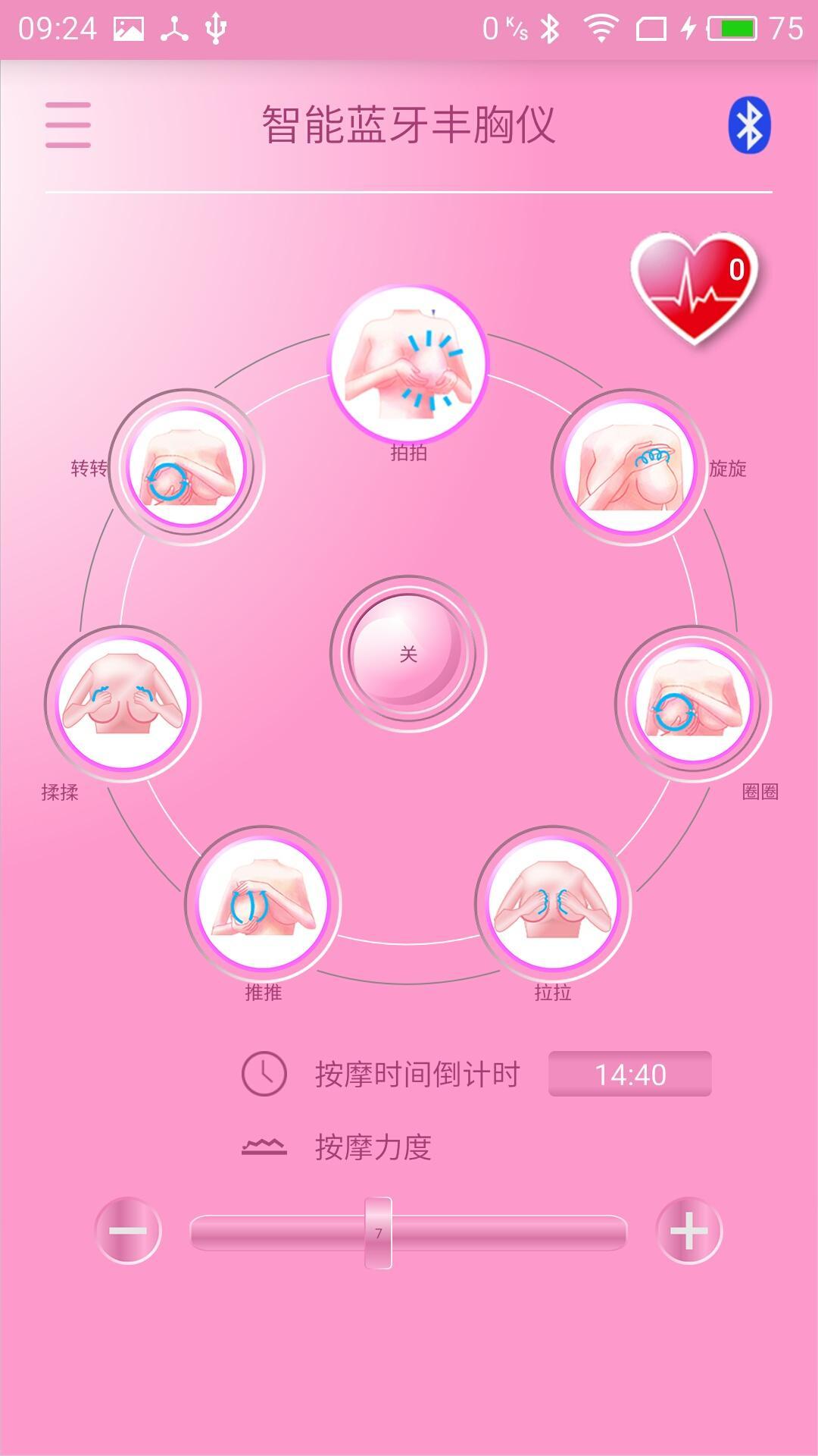 หลังจากแอพและตัวเพิ่มประสิทธิภาพเต้านมเชื่อมต่อผ่านบลูทู ธ ได้สำเร็จแล้วสามารถควบคุมการเพิ่มเต้านมได้ แอพมีปุ่มเจ็ดปุ่มเกี่ยวกับโหมดการเพิ่มประสิทธิภาพของเต้านมและปุ่มสลับ การคลิกปุ่มเหล่านี้สามารถเปิดเครื่องเพิ่มประสิทธิภาพเต้านมและเปิดโหมดเพิ่มประสิทธิภาพเต้านม มีการนับถอยหลังของเวลาการนวดภายใต้ปุ่มซึ่งสามารถควบคุมเวลาการนวดและตรวจสอบเวลาการนวด นอกจากนี้คุณยังสามารถลากแถบความคืบหน้าที่ด้านล่างเพื่อควบคุมความแข็งแรงของตัวเพิ่มเต้านม