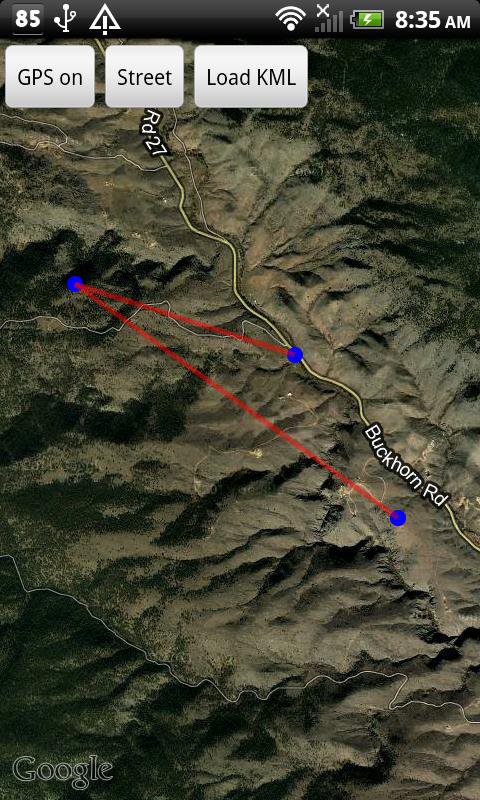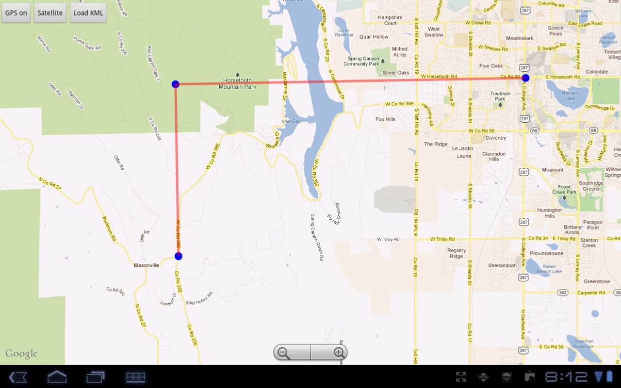 โดยจะทำงานร่วมกับแอป Triangulate ของเรา (และอื่นๆ) เพื่อแสดงไฟล์ KML เพียงกดปุ่มแผนที่ คุณสามารถเปิดและปิด GPS เพื่อติดตามการเคลื่อนไหวของคุณบนแผนที่ โดยจะโหลดไทล์แผนที่ขณะออนไลน์เท่านั้น ในขณะที่แอปแผนที่บางแอปสามารถตั้งค่าสำหรับการใช้งานออฟไลน์สำหรับผู้ใช้ขั้นสูงได้ แอป Google Maps มาตรฐานสามารถอ่านได้เฉพาะไฟล์ KML จากเว็บเซิร์ฟเวอร์เท่านั้น ดังนั้น หากคุณมีไฟล์ของคุณโฮสต์อยู่ที่ใดที่หนึ่ง คุณสามารถใช้แอป Maps ของมันได้โดยการพิมพ์ URL ลงในช่องค้นหา