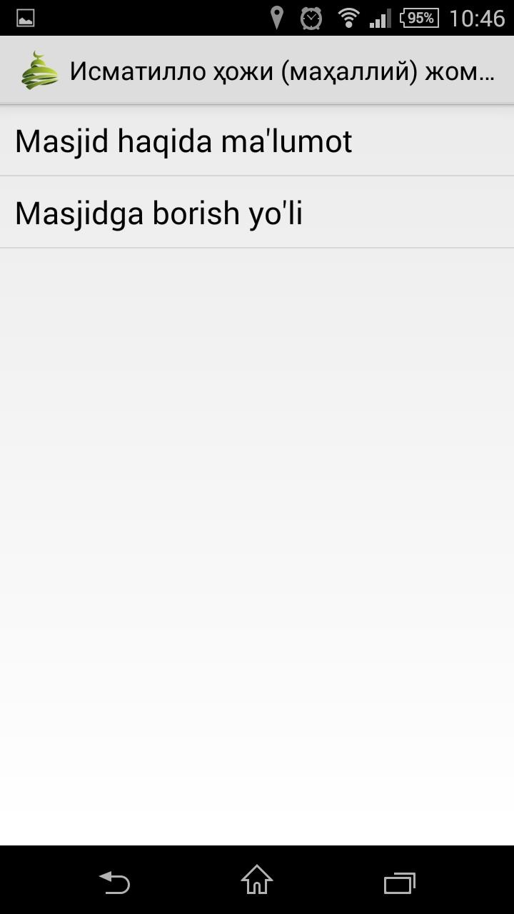 แอปพลิเคชันแสดงเส้นทางที่สั้นที่สุดไปยังมัสยิดที่เลือกในแผนที่อิเล็กทรอนิกส์ คุณสามารถรับข้อมูลโดยละเอียดเกี่ยวกับประวัติมัสยิดสถานที่ตั้งเงื่อนไขสำหรับการสวดมนต์อิหม่ามมัสยิดและพนักงานแอปพลิเคชันเชื่อมต่อกับมัสยิด UZ เพื่อรับและแสดงข้อมูล