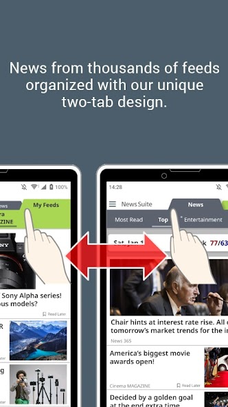 ด้วย News Suite คุณไม่จำเป็นต้องเยี่ยมชมหลายไซต์และแอพเพื่ออยู่ในความรู้อีกต่อไป มันจัดบทความจาก 1,000 ของฟีดเป็นสองแท็บดังนั้นจึงเป็นเรื่องง่ายที่จะค้นหาสิ่งที่เกี่ยวข้องกับคุณ แท็บ“ ข่าว” ช่วยให้คุณทันสมัยอยู่เสมอเกี่ยวกับสถานการณ์ปัจจุบันในขณะที่แท็บ“ My Feeds” นำบทความที่คุณปรับแต่งเพื่อความสนใจส่วนตัวของคุณ เราได้ร่วมมือกับสิ่งพิมพ์ที่ได้รับความนิยมมากที่สุดในโลกดังนั้นจึงมีเนื้อหาใหม่ที่มีคุณภาพใหม่ที่จะดึงดูดคุณ