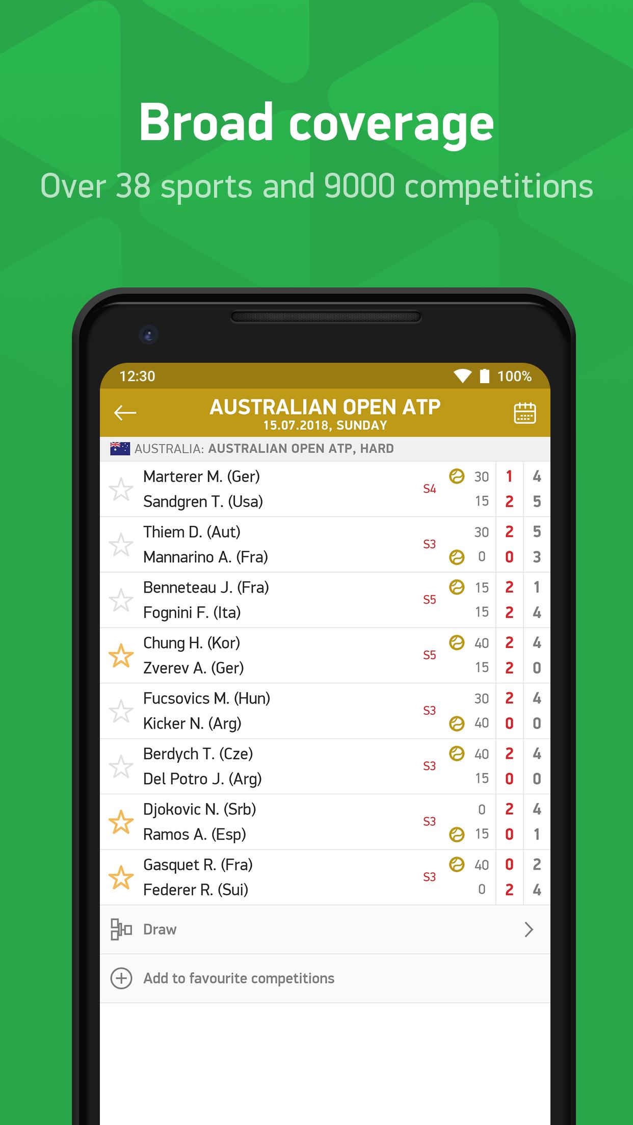 •ความคุ้มครองที่ยอดเยี่ยม: เราครอบคลุมเกือบ 30 กีฬาและการแข่งขันกว่า 5,000 รายการทั่วโลก คุณสามารถติดตามการแข่งขันฟุตบอลมากกว่า 1,000 รายการ!